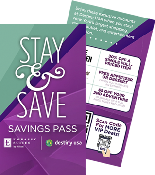 Stay at Embassy Suites by Hilton at Destiny USA and receive exclusive added perks at Destiny USA. The Stay & Save Saving Pass received at check-in is full of extra savings from various retailers, restaurants, and entertainment venues at Destiny USA. Participating brands include 5 Wits, Brooks Brothers, World of Beer, RPM Raceway, and MORE!