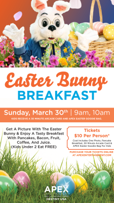 For just $10 per person (kids under 2 eat FREE), enjoy a tasty breakfast with pancakes, bacon, fruit, coffee, and juice. Plus, every child gets a 30-minute arcade card and an Apex Goodie Bag!
