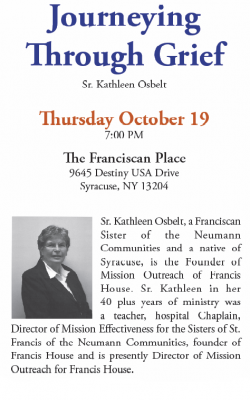 The Franciscan Place at Destiny USA, has a wonderful opportunity coming up in October for those who are struggling with grief of any kind. Sister Kathleen Osbelt, OSF; who founded Francis House, a home for the dying here in Syracuse, is set to give a lecture entitled “Journeying Through Grief on Thursday October 19th from 7-8 pm.  Learning about the various aspects of grief and hearing about the experiences of others is helpful in moving through your own loss.  It doesn’t matter how long ago your loss was, if it is still felt please join us.