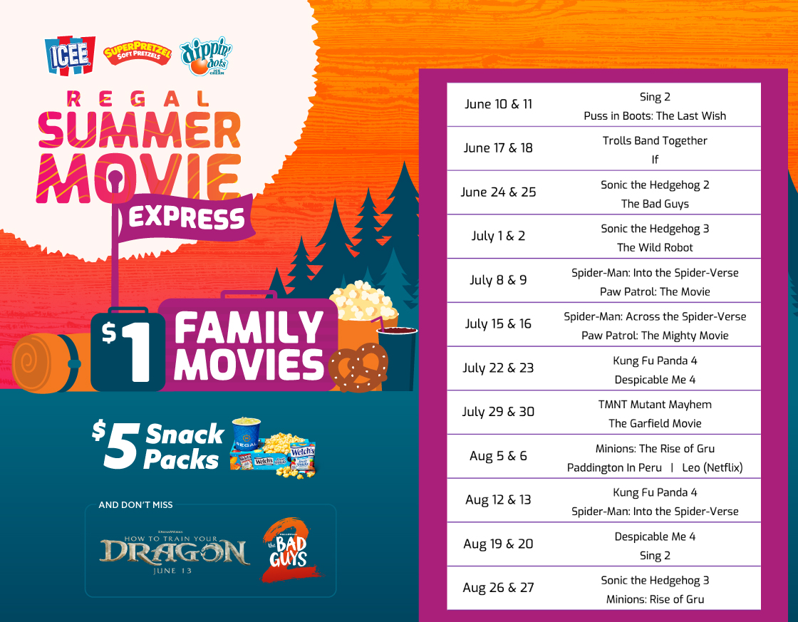 Summer is here, school is out, and this is your chance to spend some extra time with your kids. If you’re looking for affordable family activities, don’t miss Regal’s Summer Movie Express! During summer break, enjoy a series of great family movies returning to the big screen. Each week from June 10 to August 27, get $1 Summer Movie Express tickets to the first show on Tuesdays and Wednesdays.