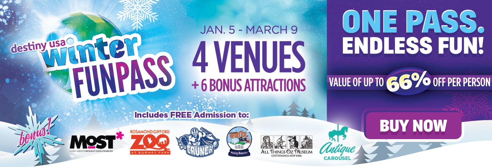 *BONUS* Each Winter Fun Pass booklet comes with one FREE admission ticket to a Syracuse Crunch Hockey Game, The MOST, the Rosamond Gifford Zoo, The Syracuse Winter Fair, The All Things Oz Museum,  and a ride on our Antique Carousel.