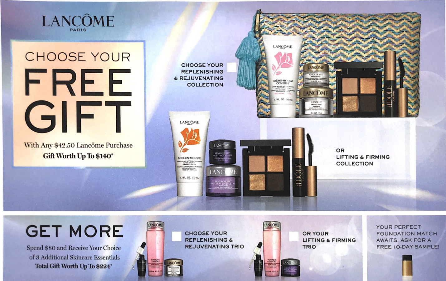 With any Lancôme purchase of $42.50 or more receive a FREE 6 piece gift! Spend $80 or more and receive an additional 3 pieces!